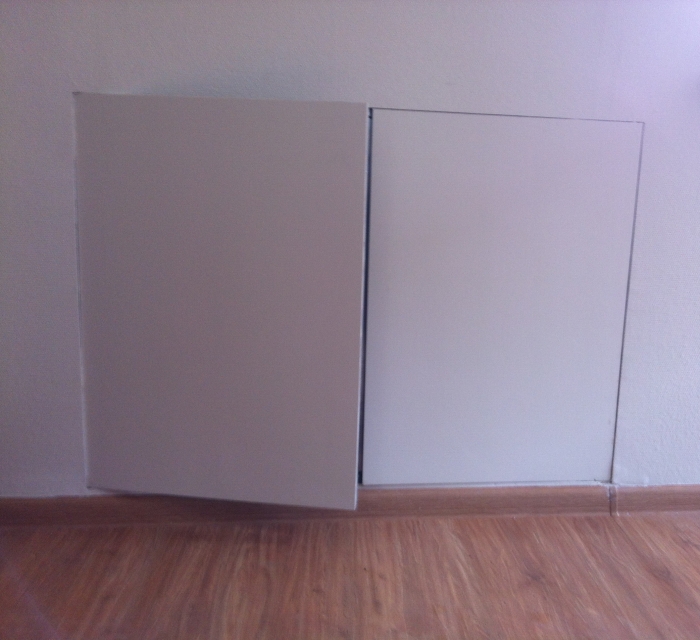 Конструкция крепится в профиль вертикальной перегородки или в кладочные материалы, выставляется в уровень финишного слоя поверхности стены, далее декорируется материалом общей отделки. Маяками служит профиль полотна, заполненного гипсоволокном.