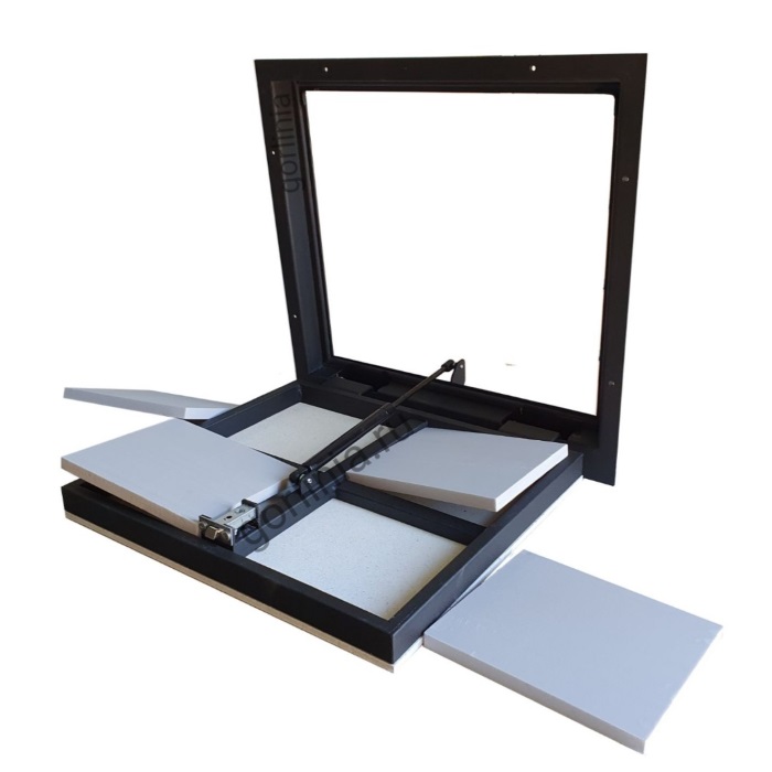 Облегченная коробка из профилированного листового проката 3 мм с наличником - есть ограничения по монтажу, свяжитесь с нами! Каркас дверки с обвязкой сварен из трубы 30х20, заполнен ГВЛ под чистовую отделку. Конструкция смещенного за ось шарнирного соединения сохраняет лаза в чистоте 1150х600 для удобства спуска по лестнице в подвал.